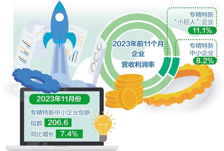 工业和信息化部最新数据显示,2023年前11个月,专精特新“小巨人”企业、专精特新中小企业营收利润率分别为11.1%、8.2%,比规上中小企业分别高6个百分点和3.1个百分点。