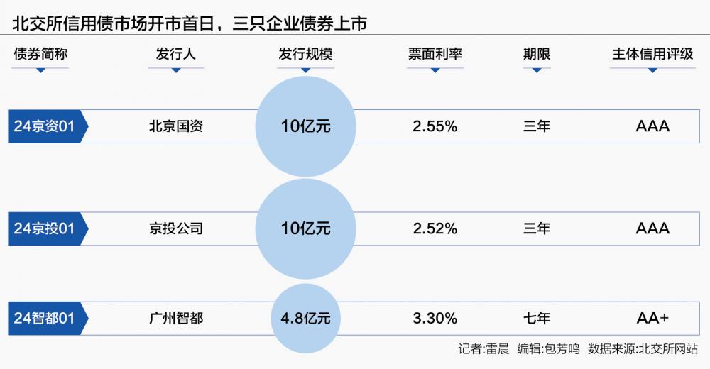 21世纪经济报道记者从北交所方面了解到,信用债市场开市首日共上市3只企业债券,发行人分别为北京国资、京投公司、广州智都,发行规模合计24.8亿元。截至目前,北交所已受理信用债项目39单,拟注册金额697.9亿元。