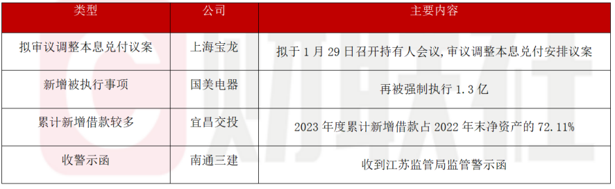 1月18日,上海宝龙实业发展(集团)有限公司发布公告,拟于2024年1月29日召开“20宝龙04”持有人会议,审议表决《关于豁免本次会议召开程序等相关要求的议案》和《关于调整本期债券本息兑付安排等事项的议案》。