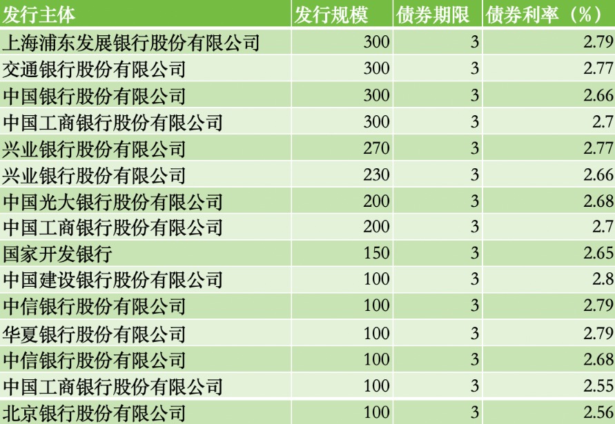除了大型国有银行、股份制银行外,金融债发行主体出现了越来越多中小银行、地方城商行的身影,如杭州联合农村商业银行股份有限公司、江苏江南农村商业银行股份有限公司、厦门银行股份有限公司、柳州银行股份有限公司、无锡农村商业银行股份有限公司、浙江温岭农村商业银行股份有限公司等。
