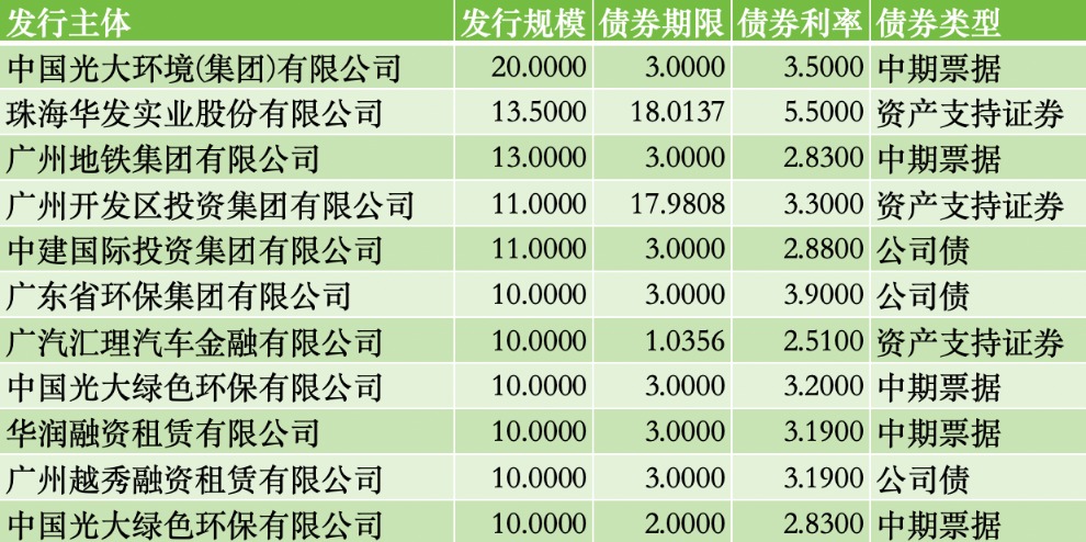 剔除金融债,广东地区发行金额超10亿元的债券笔数11笔,发行人行业涵盖轨道交通、环保、清洁能源、新能源汽车、融资租赁等领域,主体较为多样,发行人所在城市以广州、深圳为主。