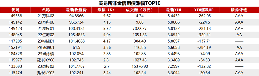 据Choice 数据统计显示,今日交易所市场非金信用债涨幅排行前五的分别是:21万科02、20万科06、21昆投01、22仁寿02、23希望E1。具体如下: