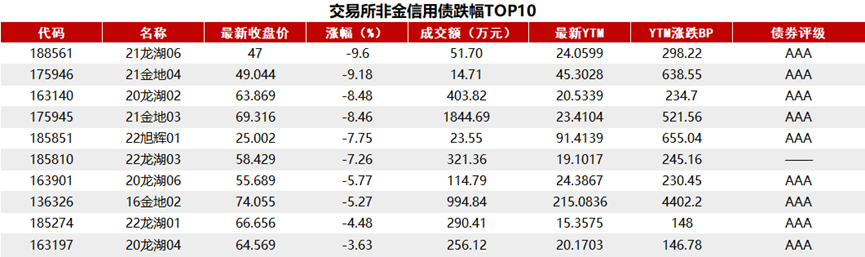据Choice 数据统计显示,今日交易所市场非金信用债跌幅排行前五的分别是:21龙湖06、21金地04、20龙湖02、21金地03、22旭辉01。具体如下: