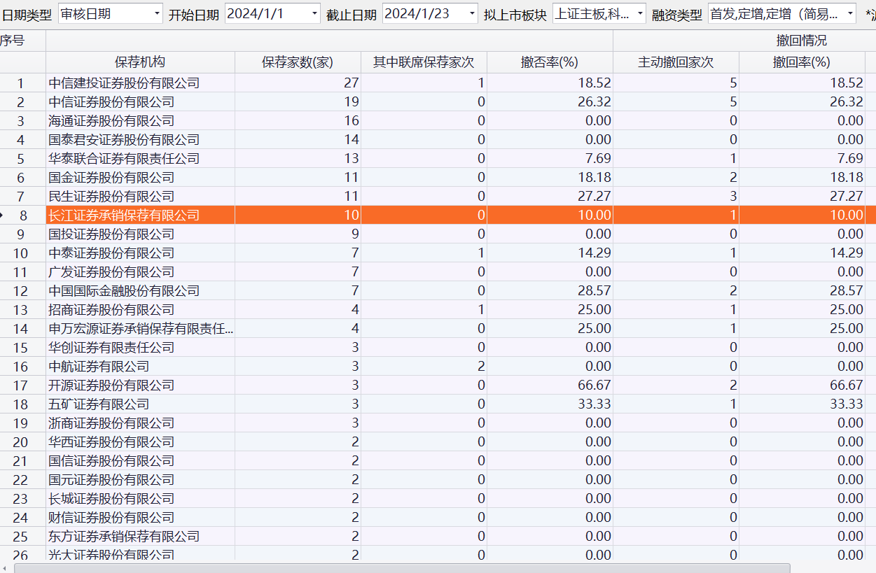 与此同时,券商保荐项目撤否率居高不下。按照审核日期,截至1月23日,年内中信建投、中信证券保荐家数分别为27家、19家,但撤否率高达18.52%、26.32%。中金公司、招商证券、申万宏源等撤否率也高于20%。