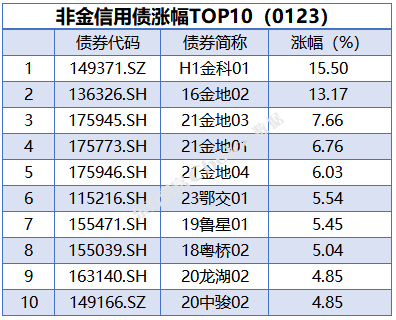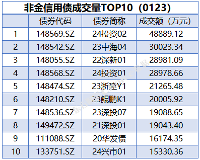 非金信用债方面,1月23日交易所成交量前三的债券为:24投资02、23中海04、22深新01;交易所涨幅前三的债券为:H1金科01、16金地02、21金地03。