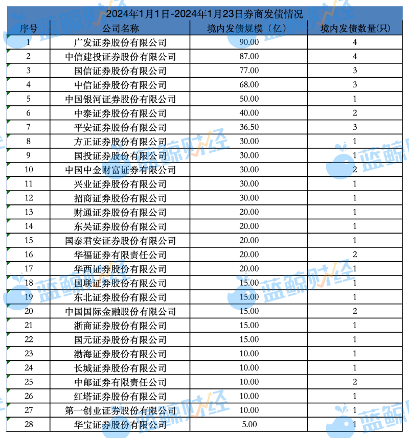 据蓝鲸财经记者不完全统计,开年以来,多家券商密集发债“补血”,用以偿还有息债务或是补充流动资金、营运资金等。截至1月23日,28家券商发债规模达到828.5亿元,此外,申万宏源、国金证券、西部证券、国联证券等百亿级规模发债审批正在推进中。