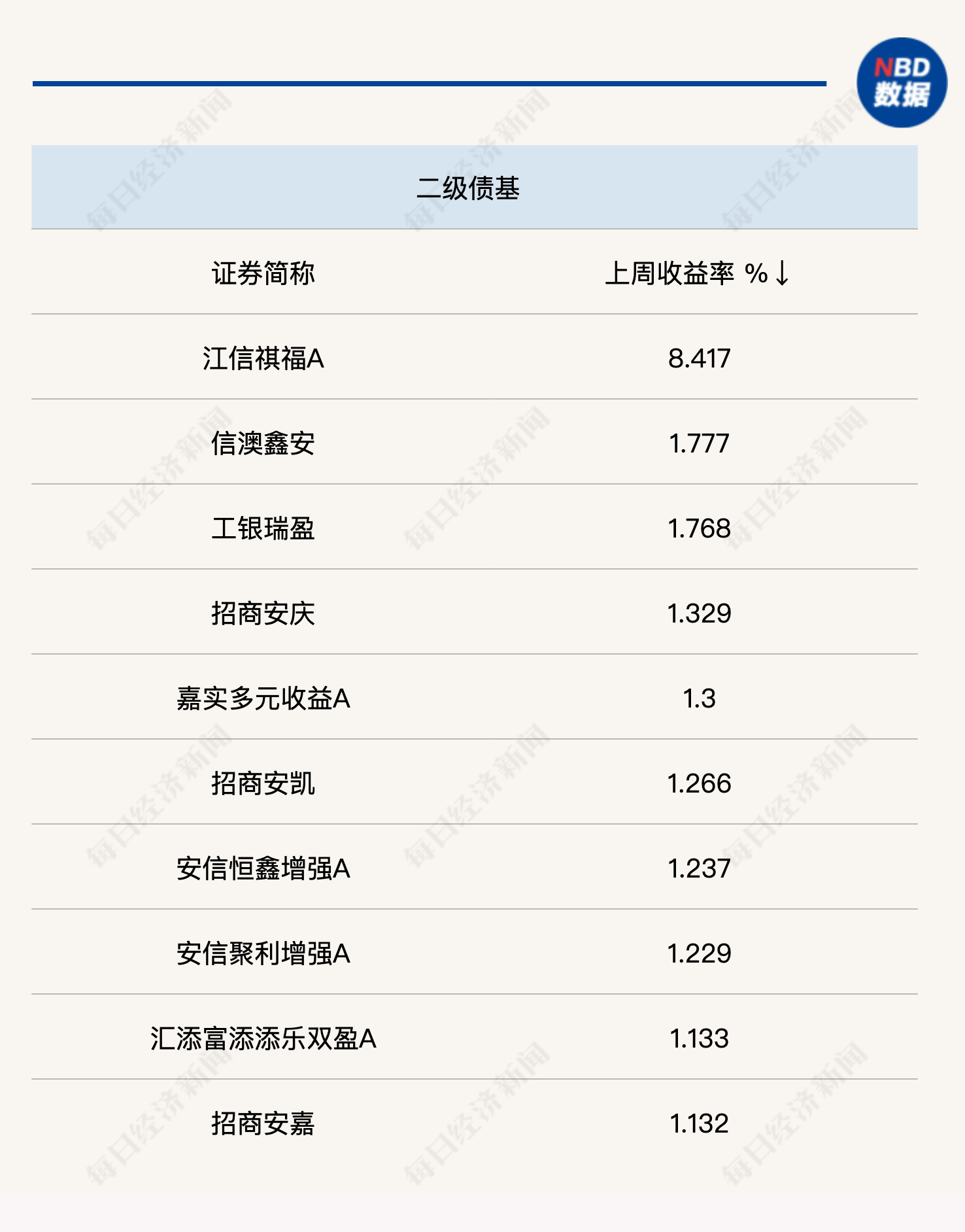 上周(1.22—1.28),权益市场的火爆也在推升含权债基走势,其中尤以二级债基表现出彩——Wind统计显示,544只同类型产品当中,有411只实现正收益,周收益胜率超过75%,部分产品的收益率水平在8%以上。
