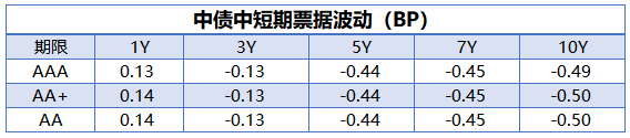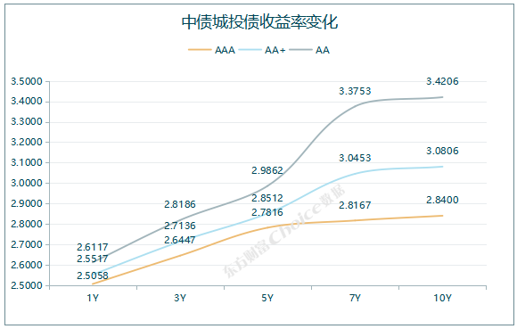 中债5年中短期票据(AAA)收益率报2.7527%,下行0.44BP;中债5年城投债(AAA)收益率报2.7816%,下行0.62BP。