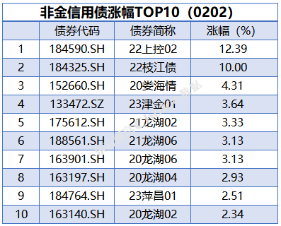 非金信用债方面,2月2日交易所成交量前三的债券为:21重发04、24珠高01、24康佳01;交易所涨幅前三的债券为:22上控02、22枝江债、20娄海情。