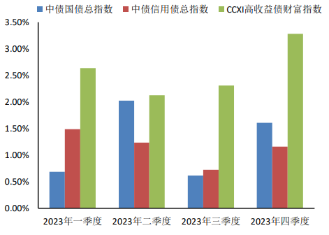 2023年,高收益债表现突出。评级机构中诚信国际的统计数据显示,受益于信用风险释放趋缓、高票息支撑和化债政策利好带来的利差压缩,CCXI高收益债财富指数全年累计上涨10.76%,明显跑赢中债国债(5.02%)和信用债财富指数(4.69%);分季度来看,高收益债财富指数收益率依次为 2.64%、2.13%、2.31%、3.28%,四季度资本利得收益丰厚。