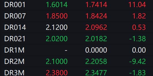 银银间回购定盘利率多数上涨。FDR001报1.7500%,涨11.00个基点;FDR007报1.8100%,跌1.00个基点;FDR014报2.1000%,涨3.00个基点。