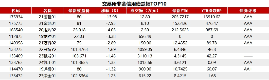 Choice 数据统计显示,今日交易所市场非金信用债跌幅排行前五的分别是:21番雅01、21金地01、20旭辉02、19龙控01、21万科02。具体如下: