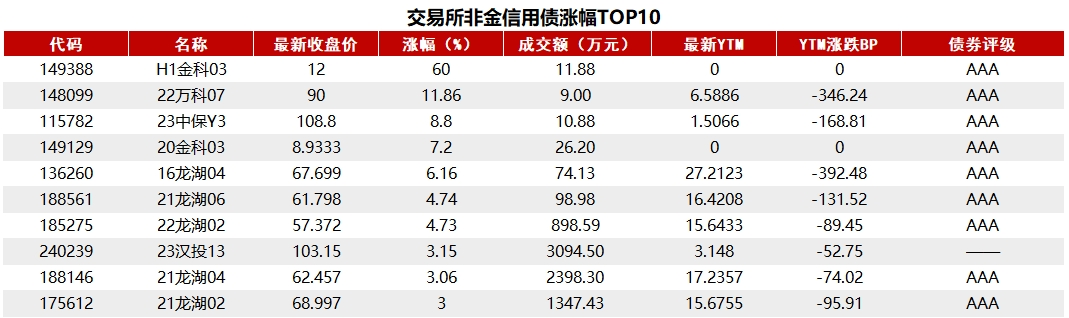 据Choice 数据统计显示,今日交易所市场非金信用债涨幅排行前五的分别是:H1金科03、22万科07、23中保Y3、20金科03、16龙湖04。具体如下: