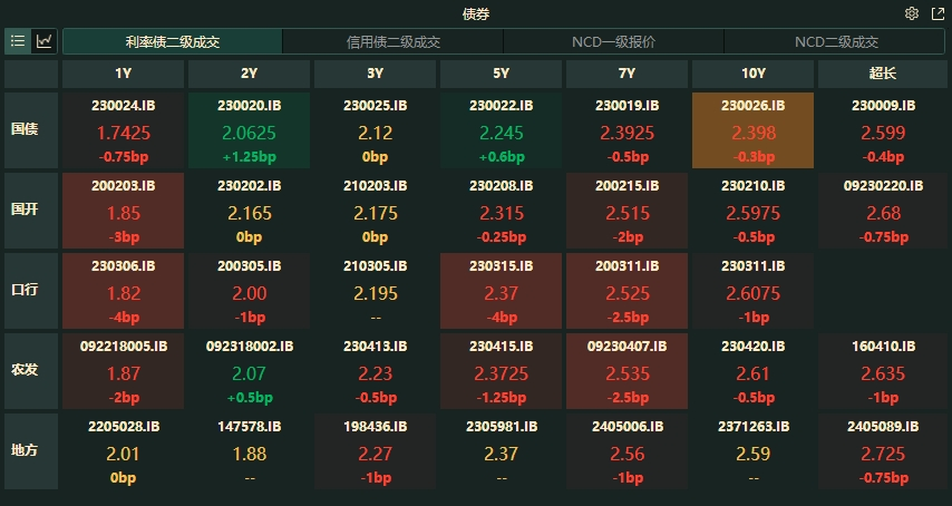 银行间主要利率债收益率多数下行,截止北京时间16:40,10年期国债活跃券230026收益率下行0.3bp报2.398%,5年期国债活跃券230022收益率上行0.6bp报2.245%,10年期国开活跃券230210收益率下行0.5bp报2.5975%。