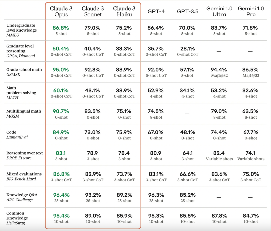 Claude 3 AI系列模型有三个,按能力由弱到强排列分别是Claude 3 Haiku、Claude 3 Sonnet和Claude 3 Opus。其中,性能最强的Opus在基准测试的多个核心指标上都全面超越了ChatGPT-4和谷歌的Gemini 1.0 Ultra,荣登目前的AI大模型榜单榜首。