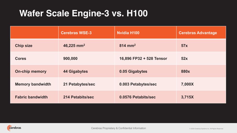 该公司称,WSE-3芯片是专为训练业界最大的 AI 模型而构建的,这款新器件使用台积电的5纳米工艺打造,包含 4 万亿个晶体管,90万个AI核心。而相比之下,英伟达H100芯片所包含的晶体管数量为800亿个。