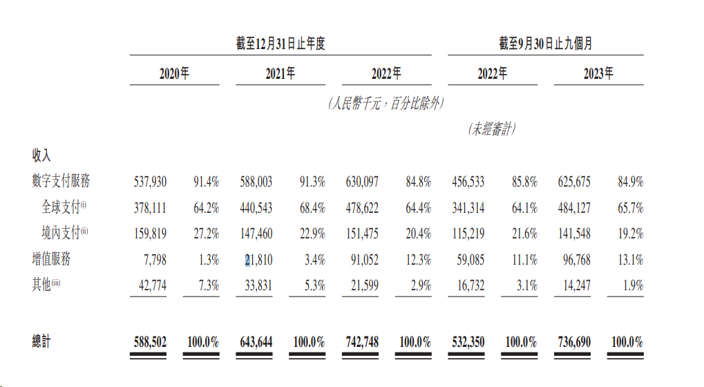 截至2023年9月30日,公司为全球各行业(包括电商、服务业及制造业)累计超过320万商户提供服务,数字支付服务总支付额(TPV)达到人民币13120亿元。