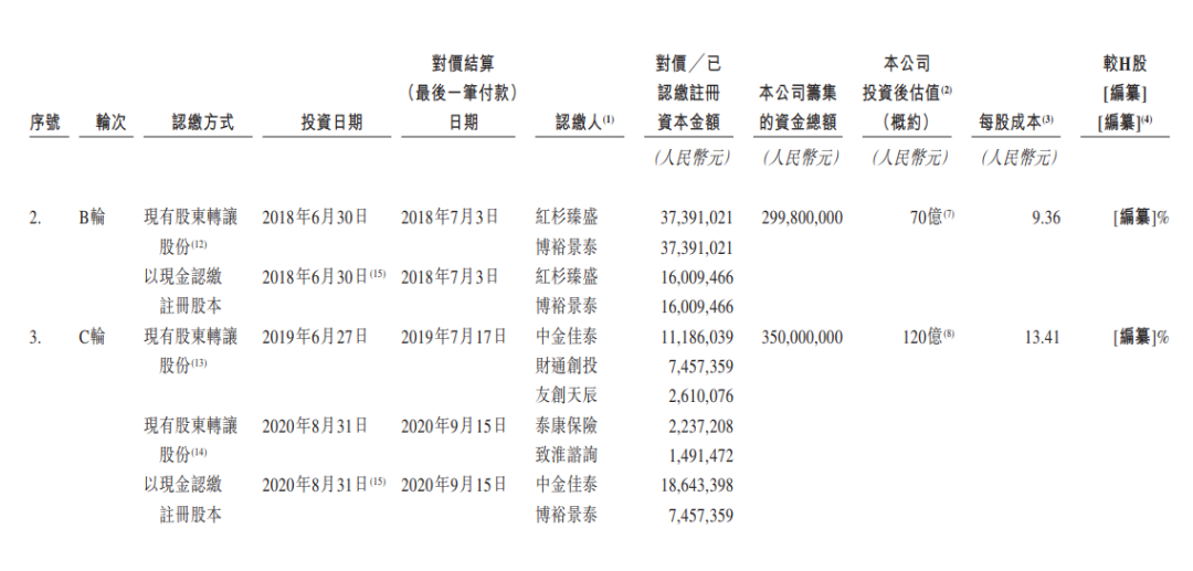 C轮融资为2019年7月开始至2020年9月15日,融资金额为3.5亿元,认购方包括泰康保险、中金佳泰、博裕景泰等,此时投后估值已经达到120亿元,短短1年时间公司估值接近翻倍,此时认购的每股成本达到13.41元。