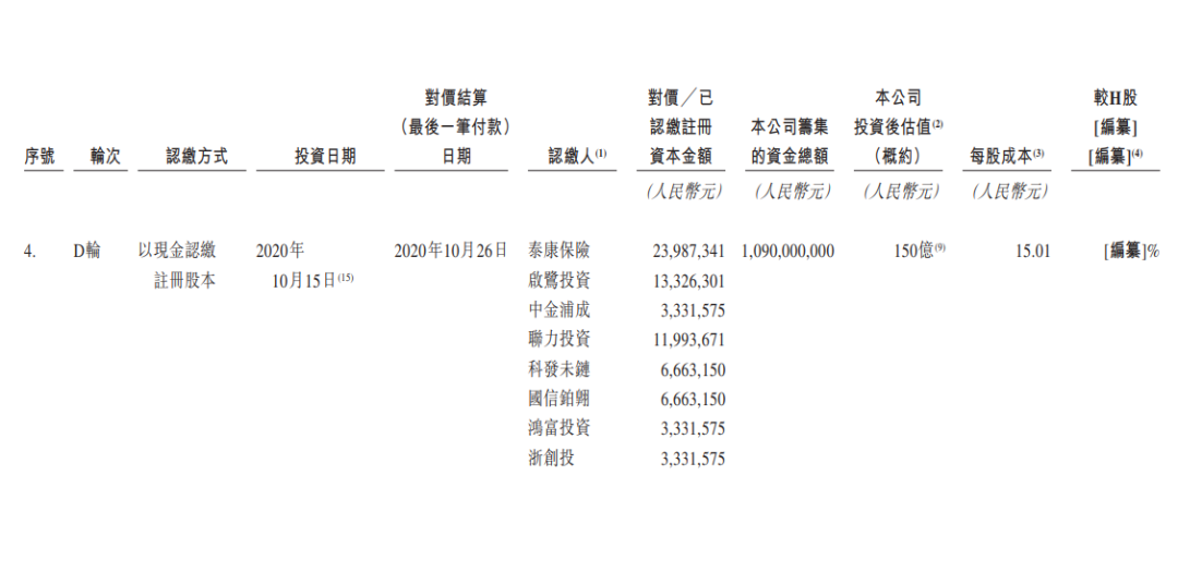 2020年10月15日,D轮融资开启,认购方包括泰康保险、启鹭投资、国信铂翱、浙创投、科发未链等,融资额达到10.9亿元,投后估值150亿元,每股成本15.01元。